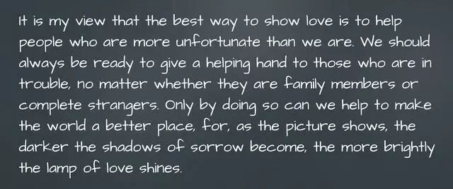 我们先以一道考研英语真题为例:“爱心是一盏灯,在越黑暗的地方越明亮”的写作题目中,范文的结束段是这样来进行的: