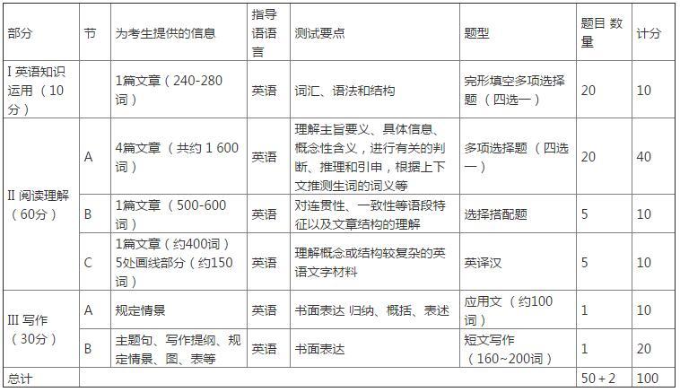 试题分三部分,共52题,包括英语知识运用、阅读理解和写作。
