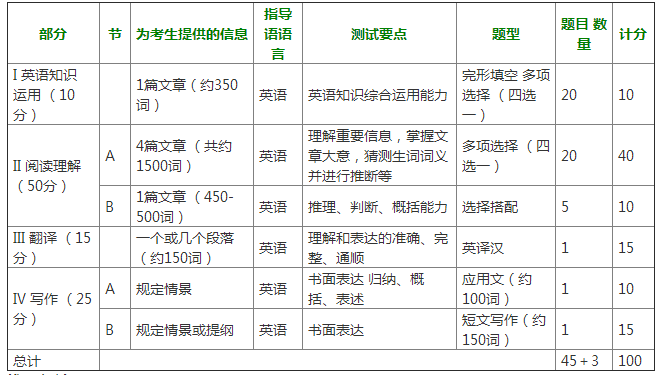 试题分四部分,共48题,包括英语知识运用、阅读理解、英译汉和写作。